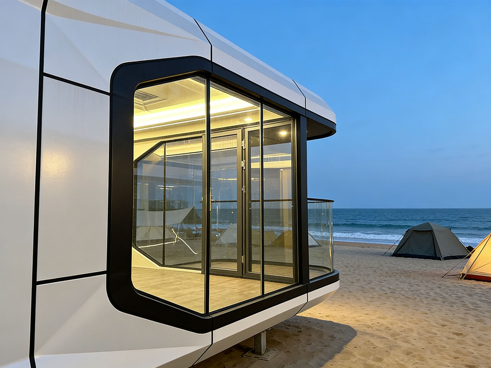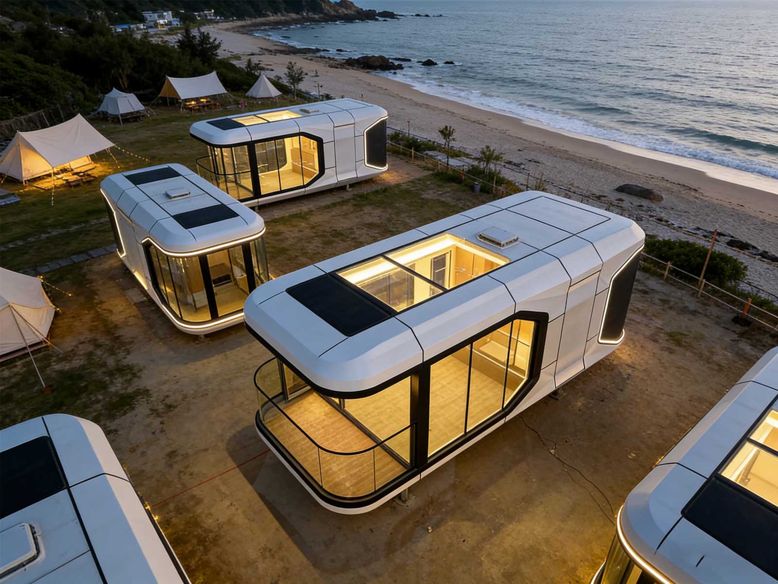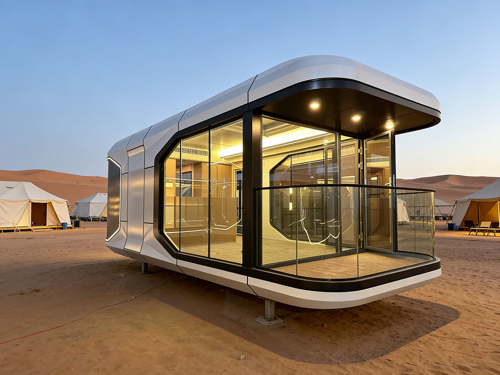 本款出口型太空舱长12.5米,主打未来感与全场景适配。采用航空级材质,耐候防腐,使用寿命超 50 年;全景玻璃幕墙搭配流线造型,自带网红流量属性。支持快速部署,可灵活部署于营地、海边、沙漠等场景;集成智能中控与光伏系统,节能舒适,是文旅民宿、高端旅居的优选解决方案。